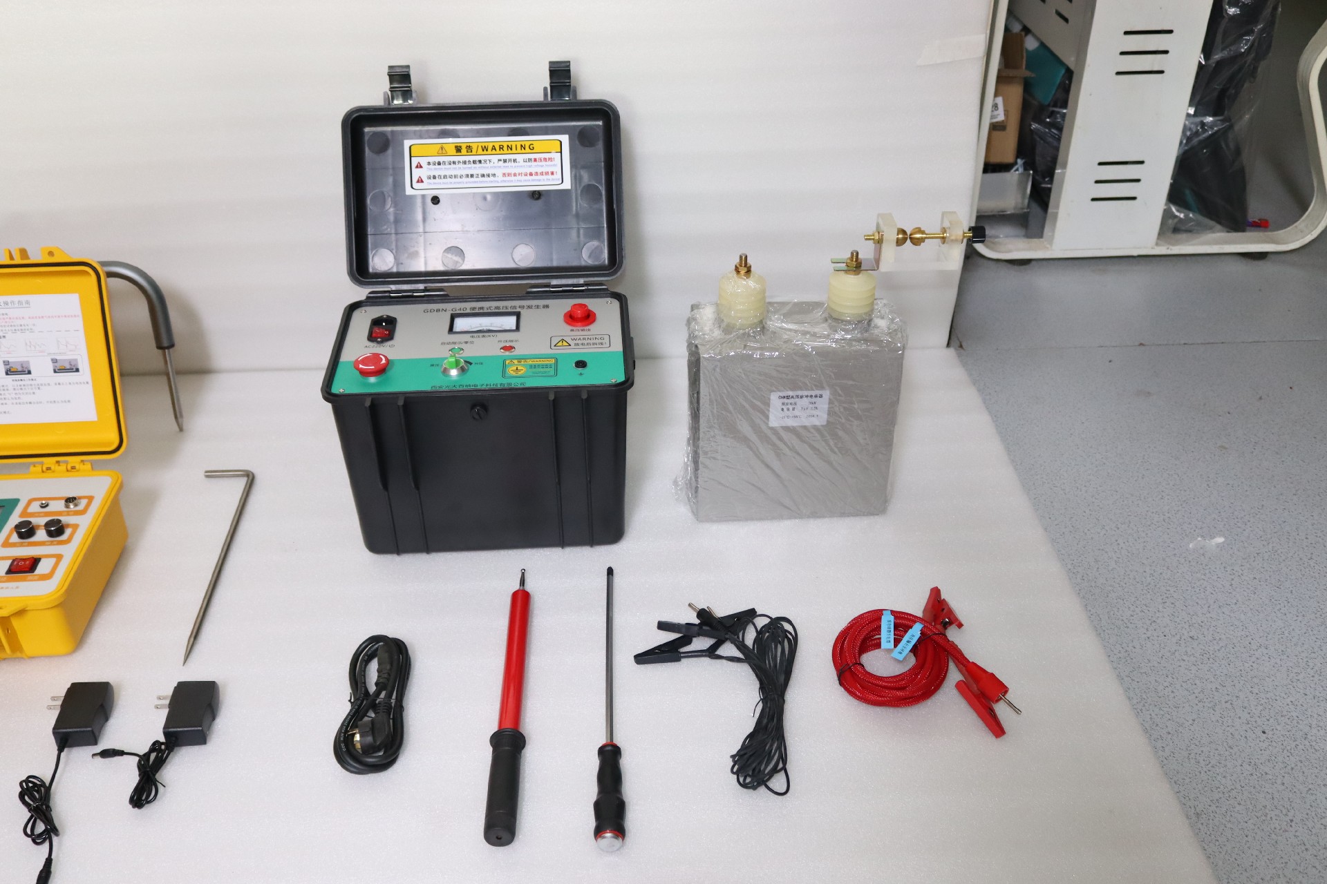 接著連接高壓線纜,從設備高壓端口至電容另一極、從球隙至故障電纜;最后仔細檢查連線是否有誤,檢查無誤后插上電源線。