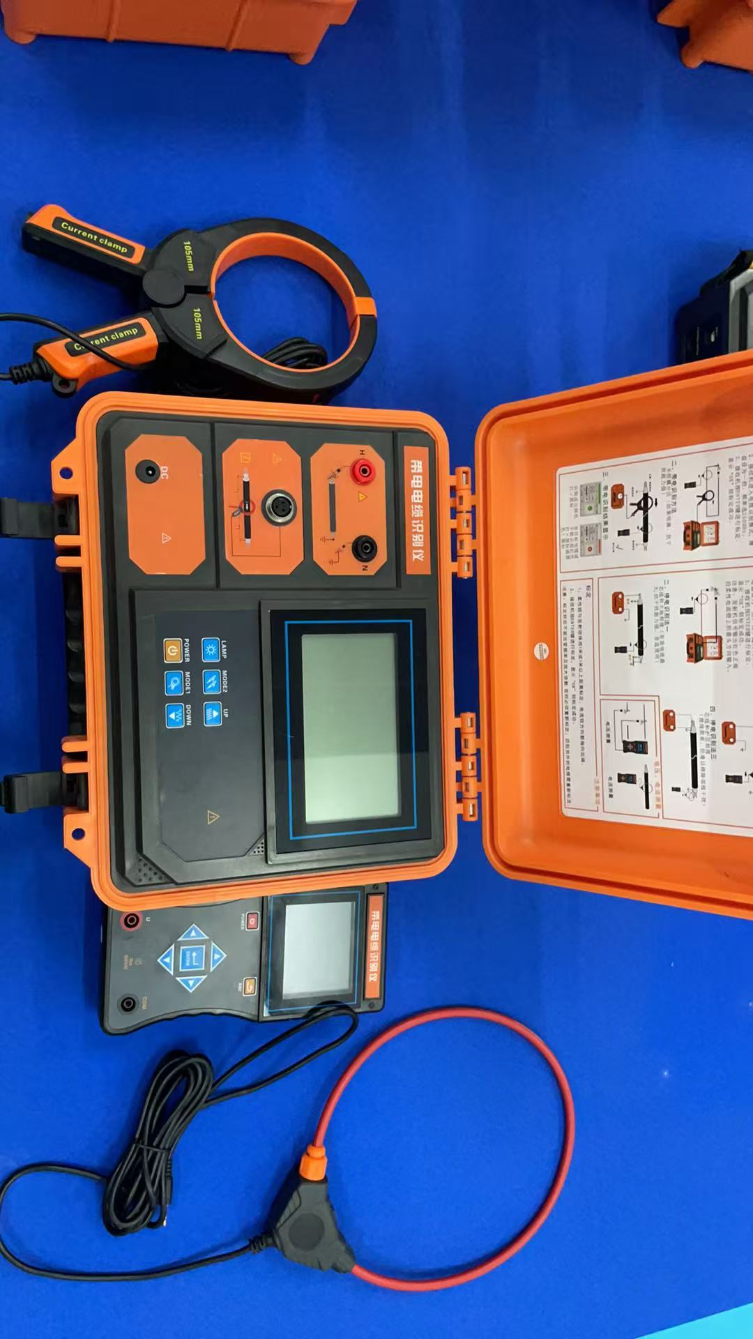 發射鉗:帶電電纜識別時,發射鉗將發射機發出的信號耦合到目標電纜上,鉗口尺寸Φ105mm,發射鉗具有方向性,發射信號從發射鉗上箭頭指示方向流入。